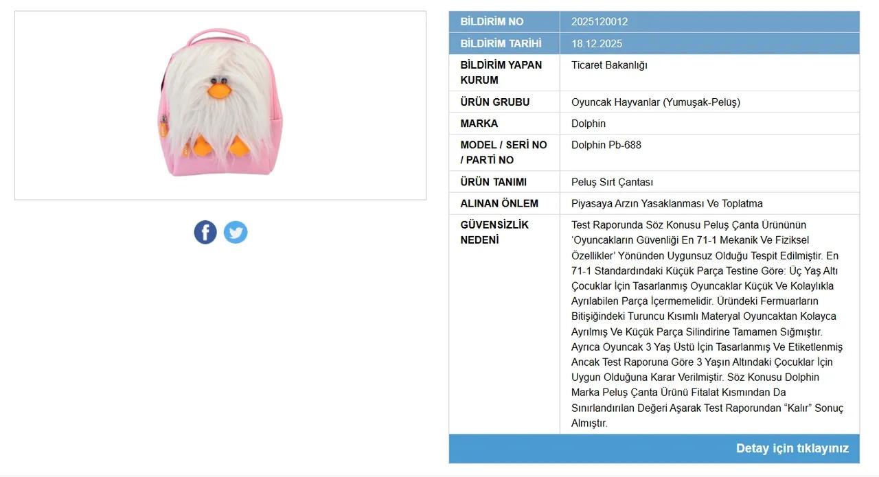 Bakanlık bir ürünü daha ifşa etti. Çocuklara yönelik pelüş sırt çantası için piyasadan toplatma kararı verildi.
