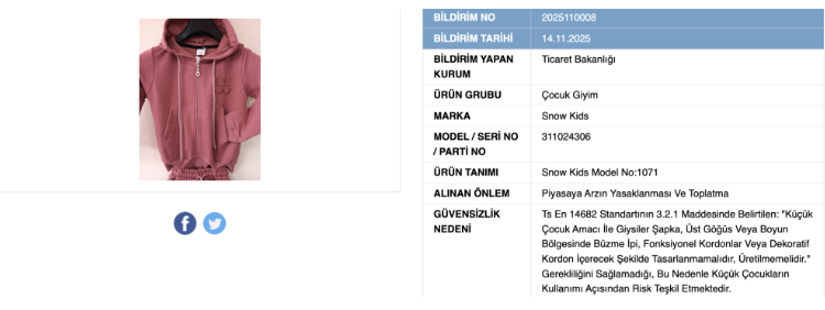 Bakanlığın Güvensiz Ürün Bilgi Sistemi’ndeki (GÜBİS) 14 Kasım tarihli bildirimine göre ‘Snow Kids’ markalı kapşonlu ceket için toplatma kararı çıkarıldı.