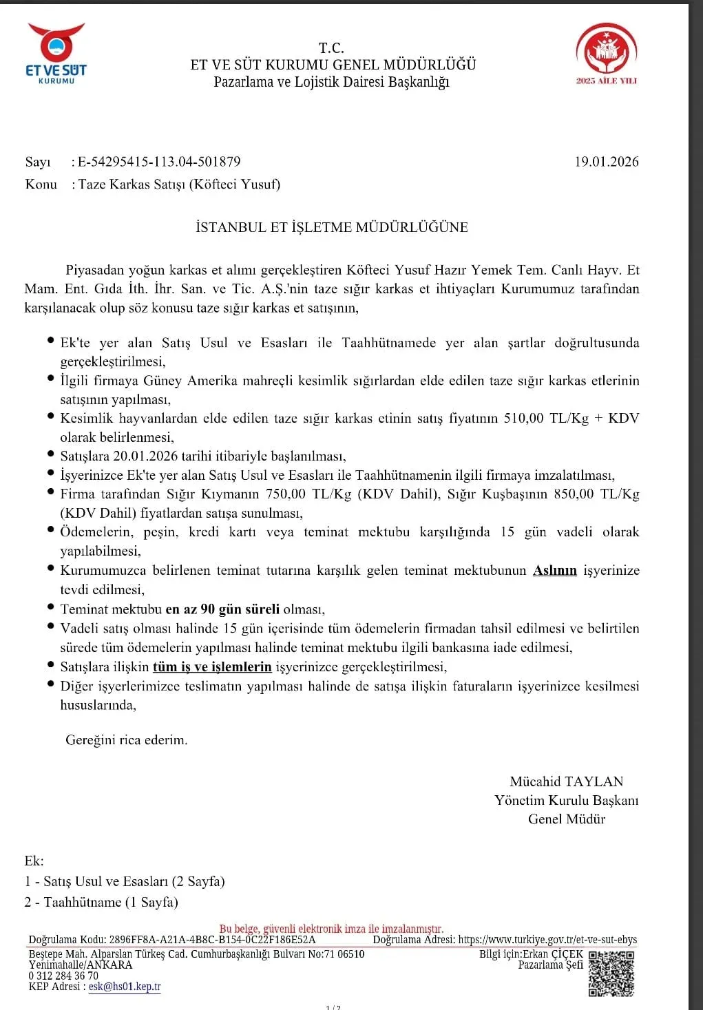 2026 yılının ilk sözleşmesini, Türkiye'nin en büyük restoran zincirleri arasında yer alan Köfteci Yusuf ile imzalayan Et ve Süt Kurumu, Güney Amerika’dan ithal ettiği sığırlardan elde edilen karkas etin kilogramını KDV dahil 510 TL'den Köfteci Yusuf'a satacak.