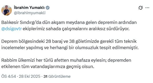 "HERHANGİ BİR OLUMSUZLUK TESPİT EDİLMEMİŞTİR"Bakan Yumaklı, sosyal medya hesabından yaptığı açıklamada, "Balıkesir Sındırgı’da dün akşam meydana gelen depremin ardından Devlet Su İşleri (DSİ) Genel Müdürlüğü’ne bağlı ekiplerimiz sahada çalışmalarını aralıksız sürdürüyor. Deprem bölgesindeki 28 baraj ve 38 göletimizde gerekli tüm teknik incelemeler yapılmış ve herhangi bir olumsuzluk tespit edilmemiştir. Rabb'im ülkemizi her türlü afetten muhafaza eylesin; depremden etkilenen tüm vatandaşlarımıza geçmiş olsun” ifadelerini kullandı.