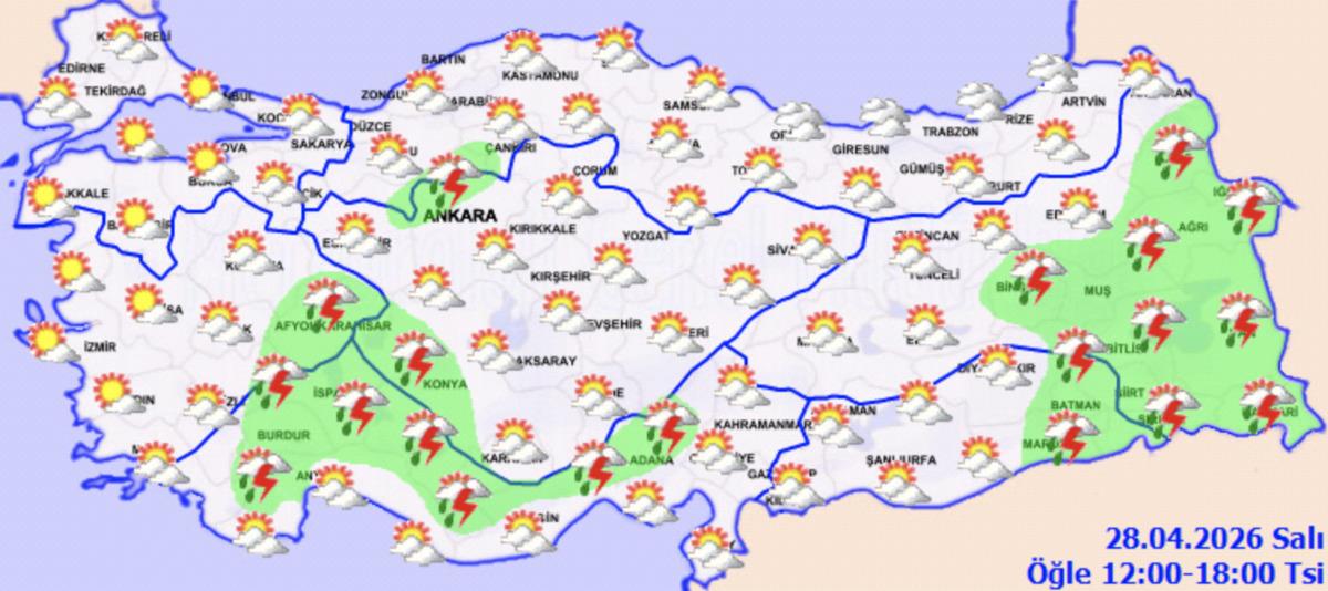 Yapılan tahminlere göre ülkenin güney, iç ve doğu kesimleri parçalı ve yer yer çok bulutlu olacak. Akdeniz’in iç kesimleri ile Doğu Anadolu’nun doğusunda sağanak ve gök gürültülü sağanak yağışların etkili olması öngörülüyor. Ayrıca Afyonkarahisar, Ankara’nın kuzey ilçeleri, Konya, Bingöl, Mardin, Batman ve Siirt çevrelerinde de sağanak ve gök gürültülü sağanak bekleniyor.