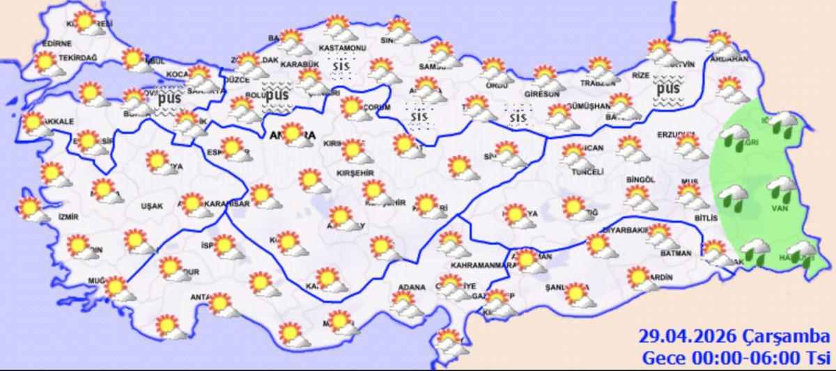 SİS VE PUSA DİKKAT!Sabah ve gece saatlerinde Marmara’nın doğusu ile Karadeniz’in iç kesimlerinde pus ve yer yer sis görüleceği tahmin edilirken, Doğu Karadeniz’in iç kesimleri ile Doğu Anadolu’da yüksek kar örtüsüne sahip eğimli alanlarda çığ ve kar erimesi riski bulunuyor. Yetkililer, özellikle bu bölgelerde yaşayan vatandaşların dikkatli olması gerektiğini vurguladı.