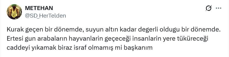 "Kurak geçen bir dönemde, suyun altın kadar degerli oldugu bir dönemde. Ertesi gun arabaların hayvanlarin geçeceği insanların yere tüküreceği caddeyi yıkamak biraz israf olmamış mi başkanım?"