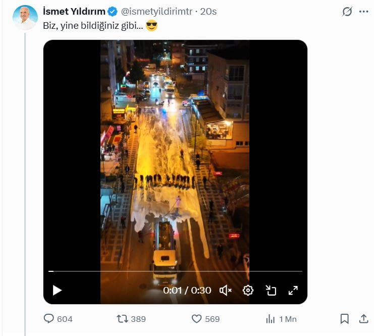 ÜMRANİYE BELEDİYESİ SOKAKLARI KÖPÜRTE KÖPÜRTE YIKADIÜmraniye Belediye Başkanı İsmet Yıldırım, sosyal medya hesabından sokakların temizlik aracıyla değil de fırça ve köpükle yıkanmasının yer aldığı bir video paylaştı.