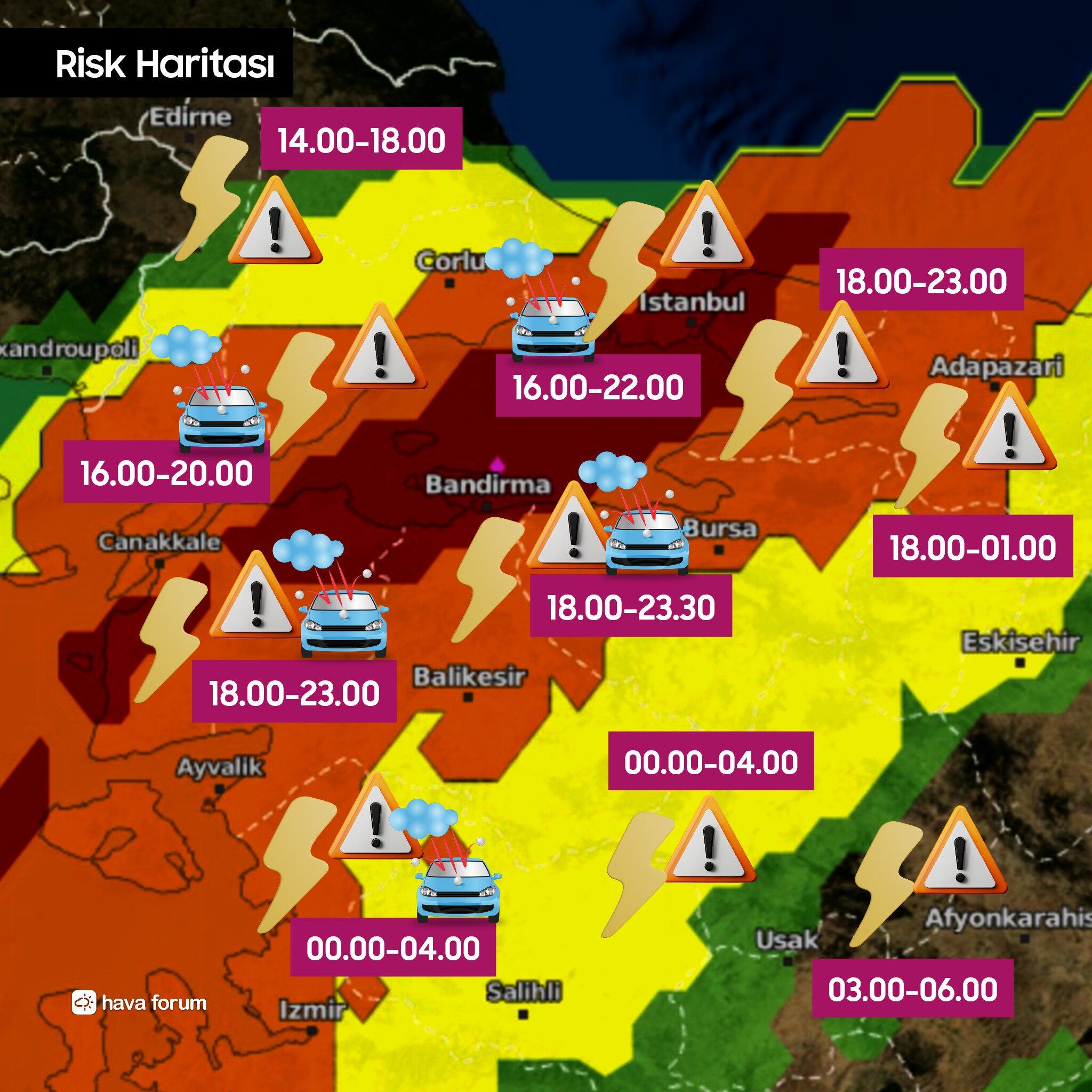 RİSK ALTINDAKİ HANGİ İLLER VAR?Yapılan son tahminlere göre sistemin en etkili olacağı şehirler arasında Edirne, Kırklareli, Tekirdağ, Çanakkale, Balıkesir, İstanbul, Bursa, Kocaeli, Sakarya, Yalova, Düzce, Zonguldak, İzmir, Bilecik ve Kütahya bulunuyor. Bu illerde ani sıcaklık düşüşleri, kısa süreli dolu yağışları ve yer yer su baskınları görülebilir.