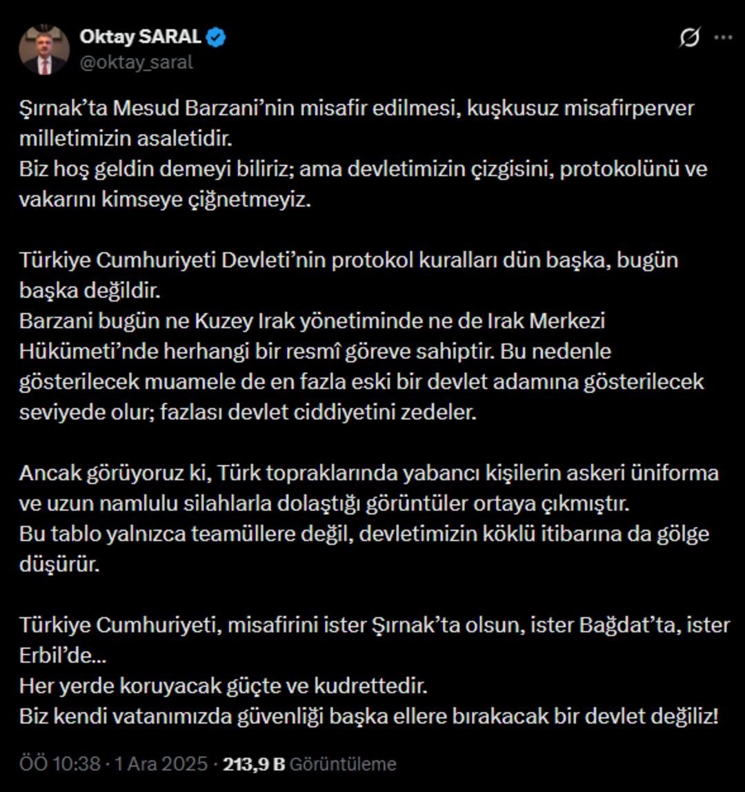Ancak Barzani'ye uzun namlulu silahları ve askeri üniformalarıyla peşmergelerin eşlik etmesiyle ortaya çıkan görüntülere tepkiler üst üste geldi. Cumhurbaşkanı Başdanışmanı Oktay Saral "Şırnak’ta Mesud Barzani’nin misafir edilmesi, kuşkusuz misafirperver milletimizin asaletidir. Biz hoş geldin demeyi biliriz; ama devletimizin çizgisini, protokolünü ve vakarını kimseye çiğnetmeyiz" dediği paylaşımında şunları kaydetti:
