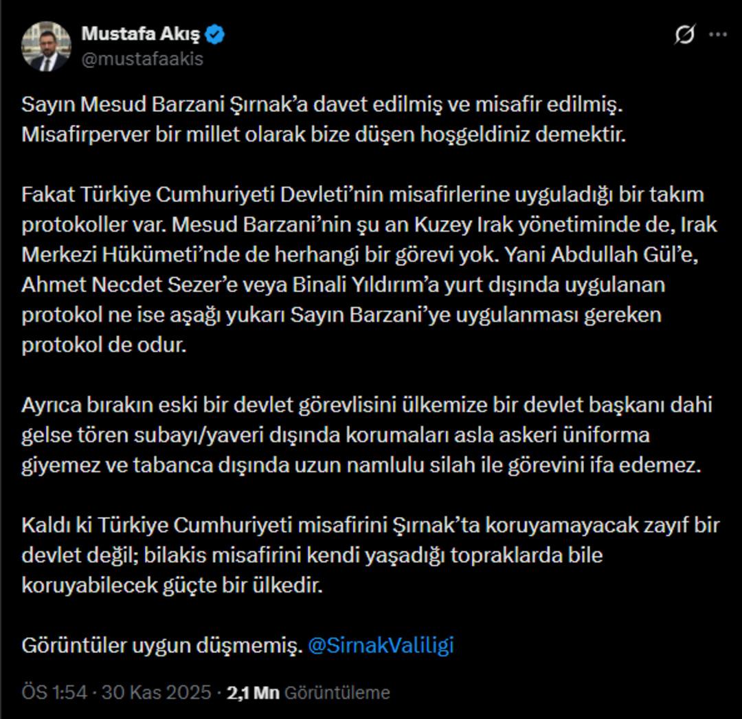 Cumhurbaşkanı Başdanışmanı Mustafa Akış da sosyal medyadan Şırnak Valiliğini etiketleyerek yaptığı paylaşımla tepki göstererek şu ifadeleri kullandı: