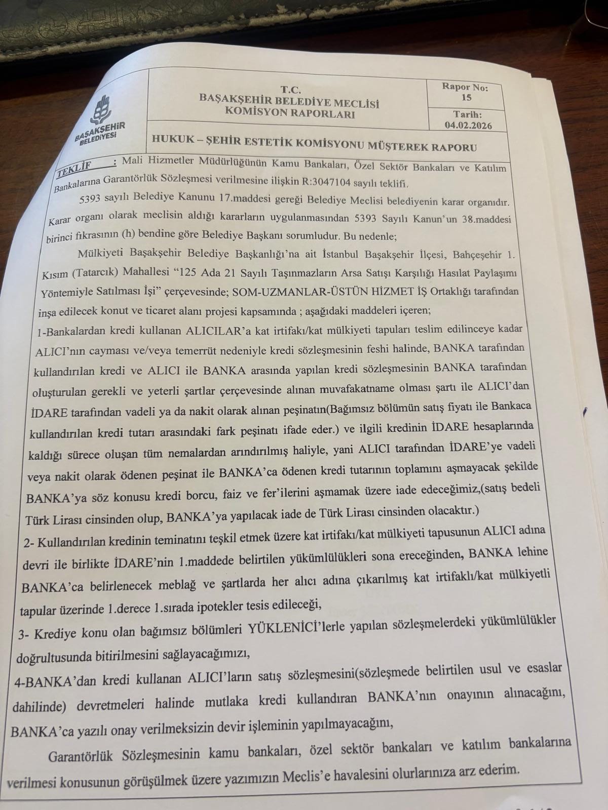 Başakşehir Belediye Meclisi’nin gündemine gelen teklife göre; mülkiyeti Başakşehir Belediyesi’ne ait olan İstanbul Başakşehir İlçesi Bahçeşehir 1. Kısım (Tatarcık) Mahallesi’ndeki 125 ada 21 parsel numaralı taşınmaz üzerinde yürütülen proje kapsamında belediye, kamu bankaları, özel sektör bankaları ve katılım bankalarıyla Garantörlük Sözleşmesi imzalamaya hazırlanıyor.