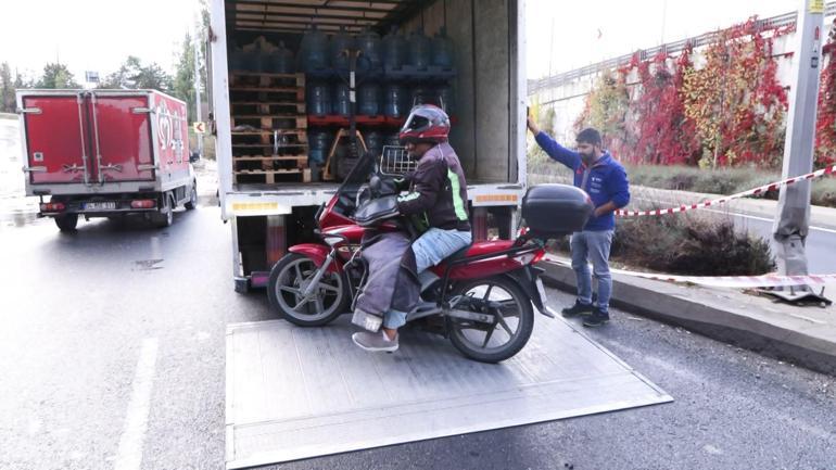 Başakşehir de su biriken yolda kalan motosikletliye kamyonet şoförü yardım etti