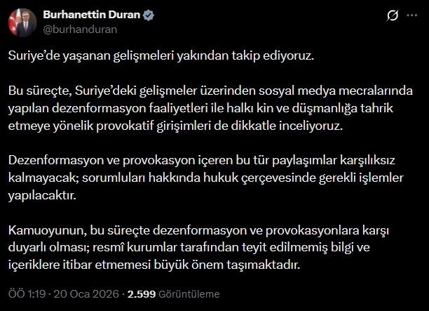 Cumhurbaşkanlığı İletişim Başkanı Burhanettin Duran, Suriye'de yaşanan son gelişmeler ve bu durumun sosyal medya yansımaları hakkında yazılı bir açıklama yaptı. Bölgedeki hareketliliğin Türkiye tarafından yakından izlendiğini belirten Duran, sosyal medya üzerinden yürütülen manipülatif faaliyetlere karşı uyarılarda bulundu.
