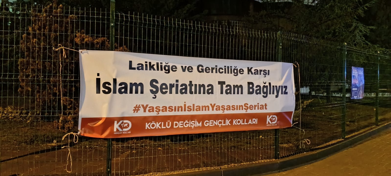 Yargıtay’ın “terör örgütü” olarak kabul ettiği Hizb-ut Tahrir'in Türkiye'deki uzantısı olan 'Köklü Değişim' isimli yapının imzası bulunan pankartlarda "Laikliğe karşı şeriata bağlıyız", "Yaşasın İslam yaşasın şeriat" ifadelerine yer verildi.
