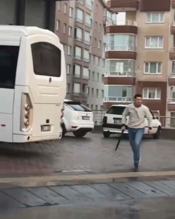 O sırada karşı taraftan biri, otomobille elindeki pompalı tüfek olan kişiye çarparak kaçtı. Çevredekiler tarafından cep telefonuyla görüntülenen kavgada E.E.B., hafif yaralandı.