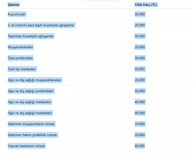 Ayrıca kuyumculuk, ikinci el araç satışı, taşınmaz ticareti, özel sağlık kuruluşları ve kıymetli maden işletmeleri gibi alanlarda yetki belgeleri ve ruhsatlar yıllık harca tabi olacak. Hürriyet'te yer alan habere göre; kıymetli maden rafinerileri için 7,5 milyon TL, ticari havacılık işletmeleri için ise 1–2 milyon TL arasında değişen ruhsat harçları alınacak. Büyükşehirlerde bu harçlar, nüfusu 30 bini aşan ilçelerde bir kat artırımlı uygulanacak.
