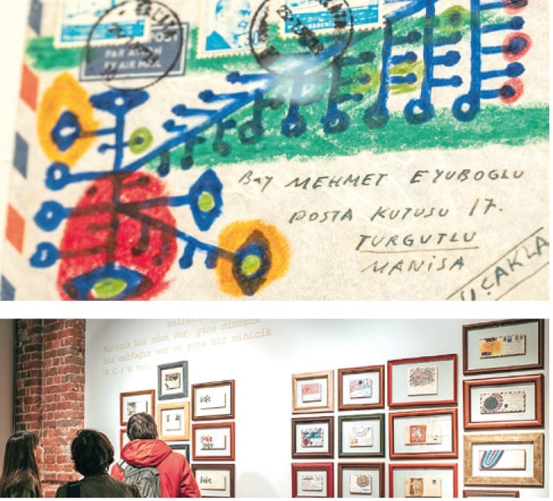 Bedri Rahmi, bu kez bambaşka bir sergiyle karşımızda… Zira duvarlarda tabloları değil ailesi ve dostlarıyla yazıştığı mektuplar ve bu yazışmalardan kullandığı mektup zarfları yer alıyor…