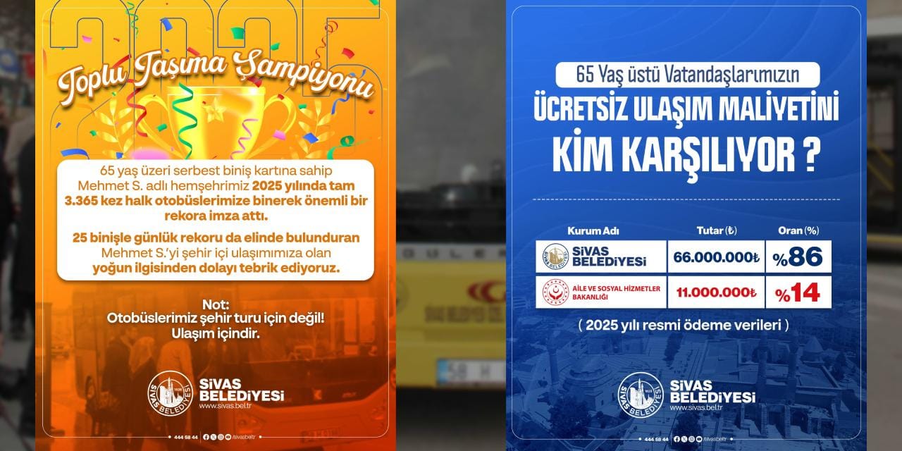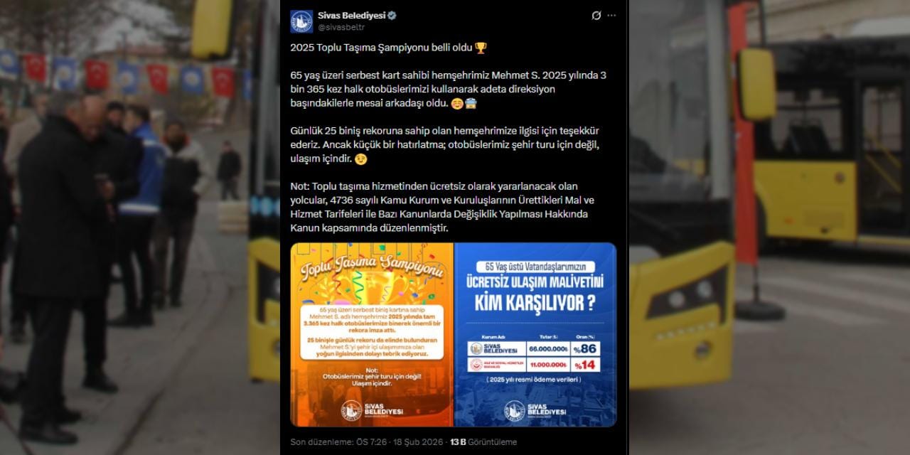 BELEDİYENİN UYARISIYLA ORTAYA ÇIKTISivas Belediyesi'nin "2025 Toplu Taşıma Şampiyonu belli oldu" paylaşımıyla ortaya çıkan rekor şu uyarıyla paylaşıldı: