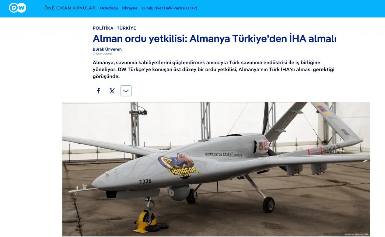 Alman yayın organı DW'nin haberine göre; bir üst düzey ordu yetkilisi, Almanya'nın Türk İnsansız Hava Araçlarını (İHA) satın alması gerektiğini söyledi.
