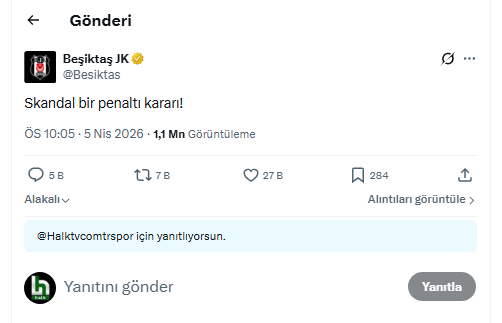 SKANDAL PENALTI İFADESİBeşiktaş Kulübü, karşılaşmanın hemen ardından sosyal medya hesabından yaptığı paylaşımda “Skandal bir penaltı kararı” ifadesini kullandı. Bu açıklama, taraftarlar arasında geniş yankı uyandırdı.