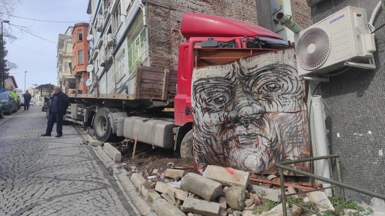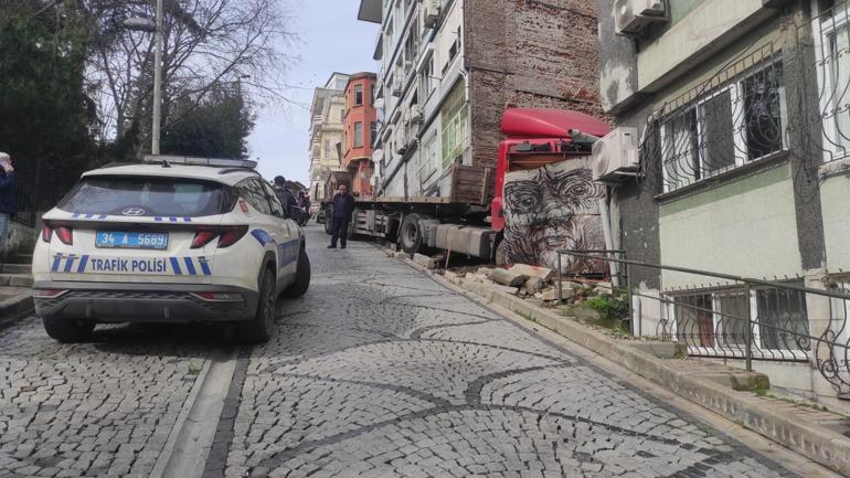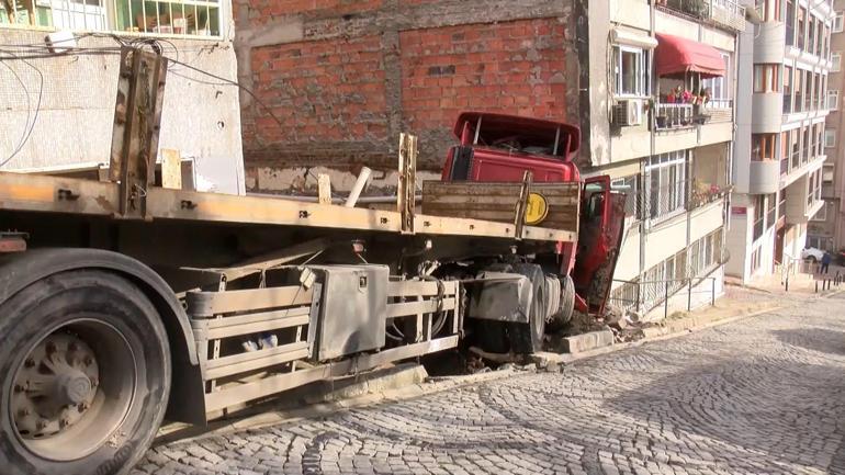 Beşiktaş’ta yokuştan kayan TIR binanın duvarına çarparak durabildi