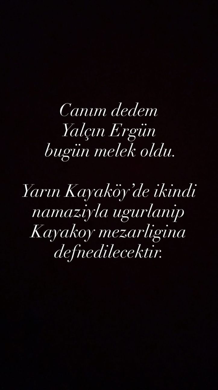 Bestemsu Özdemir, acı bir haberle sarsıldı. Ünlü oyuncunun dedesi Yalçın Ergün, hayata veda etti. Özdemir, acı haberi; "Canım dedem Yalçın Ergün bugün melek oldu. Yarın Kayaköy'de ikindi namazıyla uğurlanıp Kayaköy mezarlığına defnedilecektir" sözleriyle duyurdu.