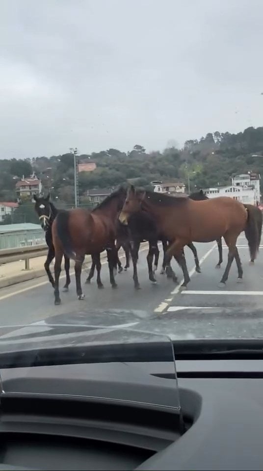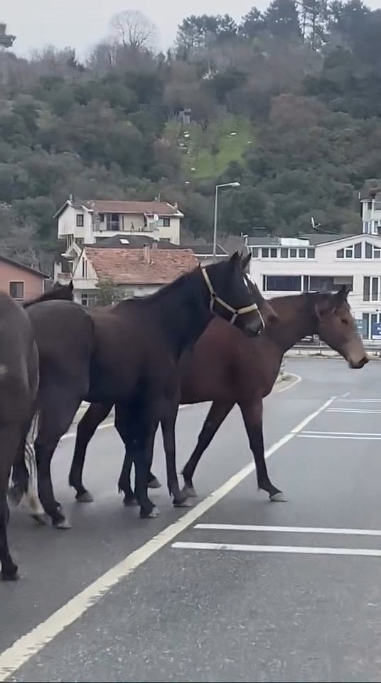 Bir süre bölgede bekleyen atlar, daha sonra ters istikamete yönelerek gözden kayboldu. Yaşananlar, o sırada yoldan geçen bir sürücünün cep telefonu kamerasına yansıdı.