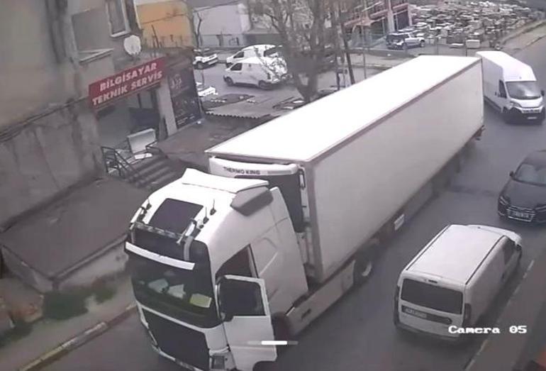 Yakuplu Mahallesi'nde dün öğle saatlerinde iddiaya göre bir TIR şoförü araçtan inerken el frenini çekmeyi unuttu. Araç geriye doğru kaymaya başladı. Şoför, aracın hareketlendiğini görünce koşup, müdahale etmek istedi. Ancak, aracın hızına yetişemedi. TIR'ın dorsesi, arkasındaki kapalı kasa minibüse çarptı. Şans eseri yaralanan kimsenin olmadığı kaza, bir iş yerinin güvenlik kamerasına yansıdı.