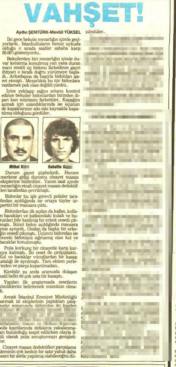 DİKKAT ÇEKEN KAYNAK Cesetlerin kimliğine dair hiçbir ipucu yoktu. Çevrede yapılan çalışmalarda bidonları bırakan kişi ya da kişileri gören bir tanık da yoktu. Her olayda önce maktulün kimliğinin önemli olduğunu bilen Cinayet Masası dedektiflerinin işi zordu. Bir dikkat çeken nokta da bidonların kaynaklanmış olmasıydı. Bu işte bir kaynakçının parmak işi olabilir miydi? Çünkü ceset konulan teneke bidonlar profesyonel şekilde kaynak edilmişti. Ve tabii ki en önemlisi ise öldürülüp parçalara ayrılan iki erkek ceset kimlere aitti? Kim tarafından ve neden öldürülmüşlerdi? Tüm bu soruların yanıtını Cinayet Masası'nın yapacağı çalışmalar verecekti.
