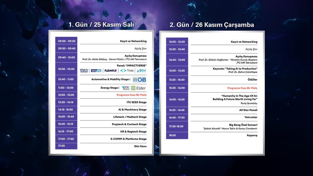 Girişimcilik dünyasının en çok merak ettiği ödül ve yatırım duyuruları, etkinliğin ikinci gününün merkezinde yer alacak. İkinci günün açılış konuşmasını İTÜ ARI Teknokent Yönetim Kurulu Başkanı Prof. Dr. Gülsün Sağlamer gerçekleştirecek. Ardından yapay zekâ alanında uluslararası başarılarıyla tanınan Prof. Dr. Zehra Çataltepe ile küresel vizyoner konuşmacı Tariq Qureishy’nin keynote sunumları, teknoloji odaklı gelecek senaryolarını masaya yatıracak. İki gün boyunca özel şovlar ve etkileşimli performanslarla zenginleşen etkinlik, Harun Tekin ve Koray Candemir’in “Şakalı Akustik” performansıyla unutulmaz bir kapanış yapacak.