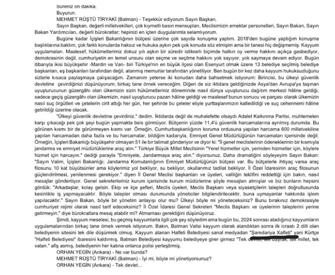 DEM Partili Mehmet Rüştü Tiryaki ise “Jin kart” ve “Şaredariya Xelfetî” (Halfeti Belediyesi) ifadelerini Kürtçe olarak kullandı. Tiryaki'nin bu ifadesi kullandığı şekilde tutanağa yansıdı.