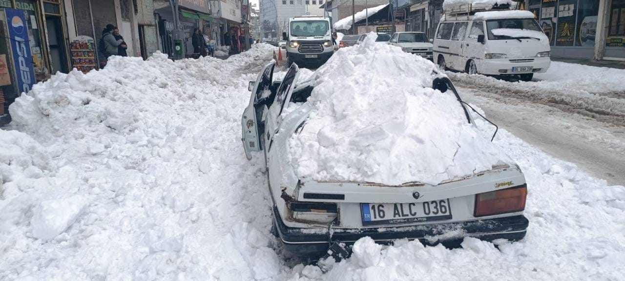 ŞANS ESERİ YARALANAN OLMADIMerkez Dere Mahallesi Bitlis Caddesi’nde meydana gelen olayda, Rahmi Sönmez’e ait 16 ALC 036 plakalı otomobilin üzerine, binanın çatısında biriken kar ve buz kütlesi büyük bir gürültüyle düştü.