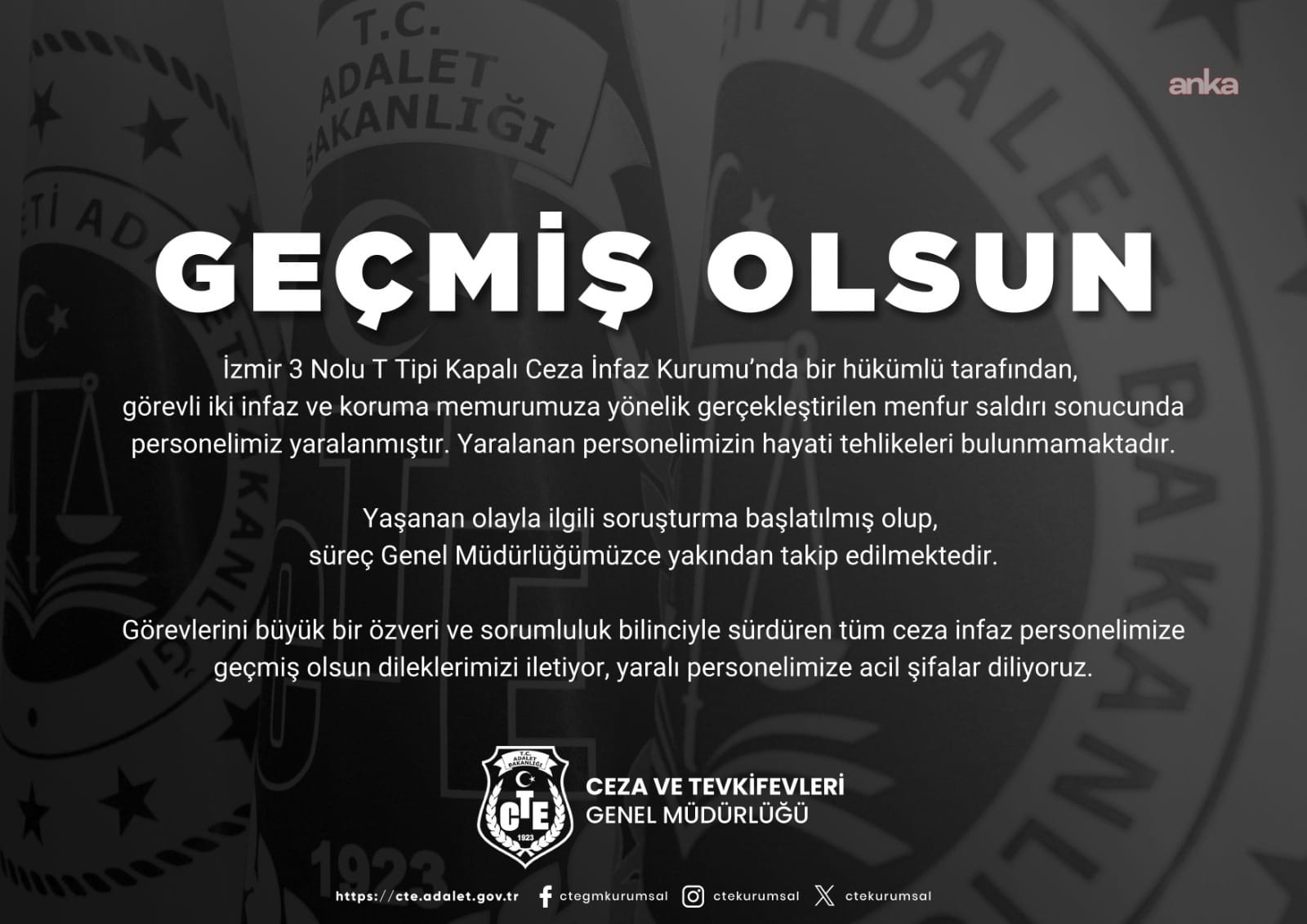 Ceza ve Tevkifevleri Genel Müdürlüğü, görevlerini özveri ve sorumluluk bilinciyle sürdüren tüm ceza infaz personeline geçmiş olsun dileklerini ileterek, yaralanan personele acil şifalar diledi.