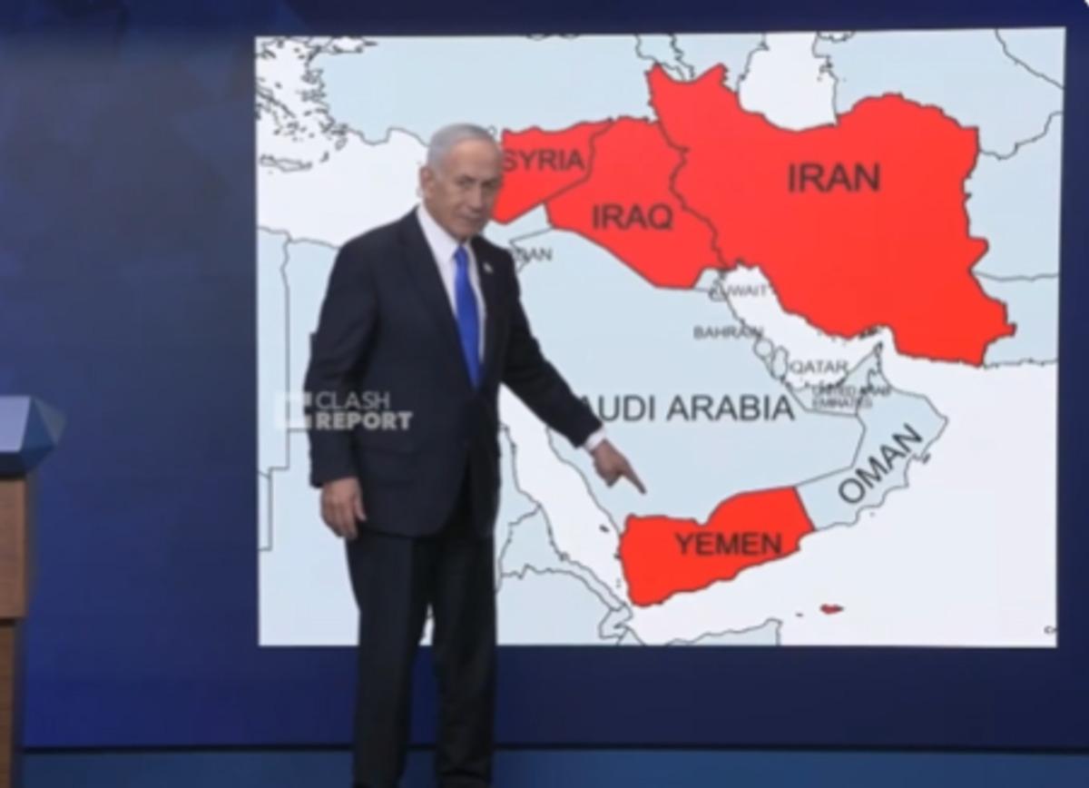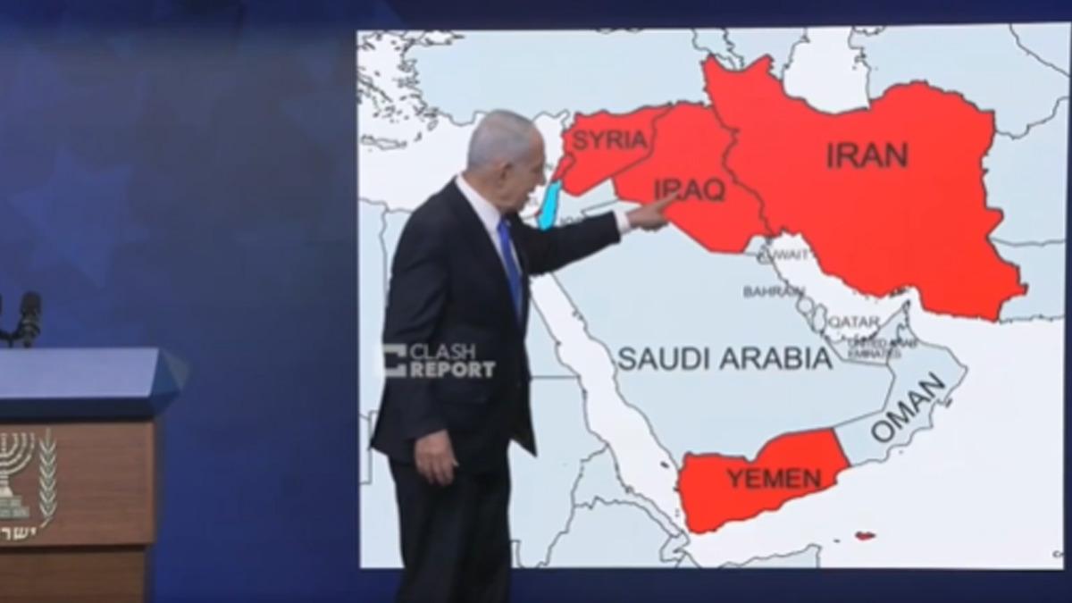 Ekrana yansıtılan Orta Doğu haritasında işaretli olan Suriye, Irak, İran ve Yemen'i eliyle işaret eden Netnayahu, "İran'a karşı savaş bitmedi hâlâ yapacak daha çok işimiz var" dedi.
