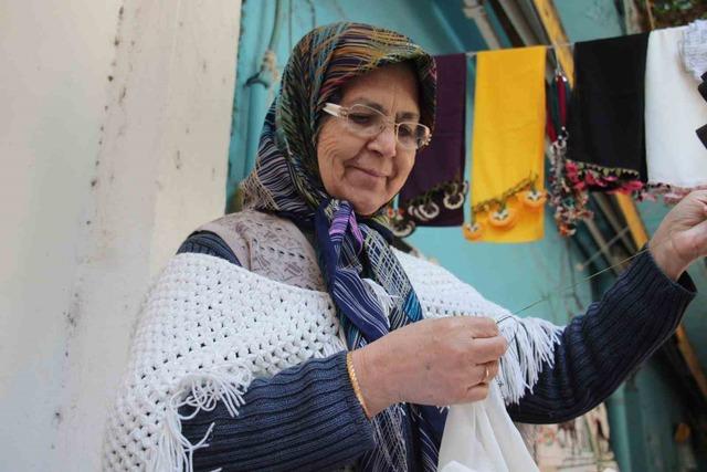 "Yengem öğretmenlikten emekli olunca birlikte bu işe başladık. 15 senedir bu işi yapıyoruz. Bu sokak önceleri komple dolu oluyordu ama şimdilerde az kişi kaldık. Zaman geçtikçe bu işi yapanlar yaşlandı ve azaldı. Şimdilerde 5-6 kişi bu işi devam ettirelim diye uğraşıyoruz. Her hafta buraya geliyorum, Allah bereket versin ekmek paramızı kazanıyoruz. Buraya genç kızlardan ziyade anneleri geliyor, kızlarının çeyizlerini tamamlıyorlar. Bir de buraya ellerindeki el emeklerini satmak için gelenler de oluyor. Krep oyasını bir haftada takıyorum sonra buraya alıp gelip satışını yapıyorum. Zaten müşterilerimiz de hazır oluyor gerek toptan gerekse de tek tek satışını yapıyoruz. Tığ işi kolay ama iğne oyası çok zor. Sabır ve zaman istiyor, emeği çok. İğne oyasına baka baka el emeğini işlerken gözler de ister istemez bozuluyor ve gözlük kullanmaya başlıyoruz" dedi.