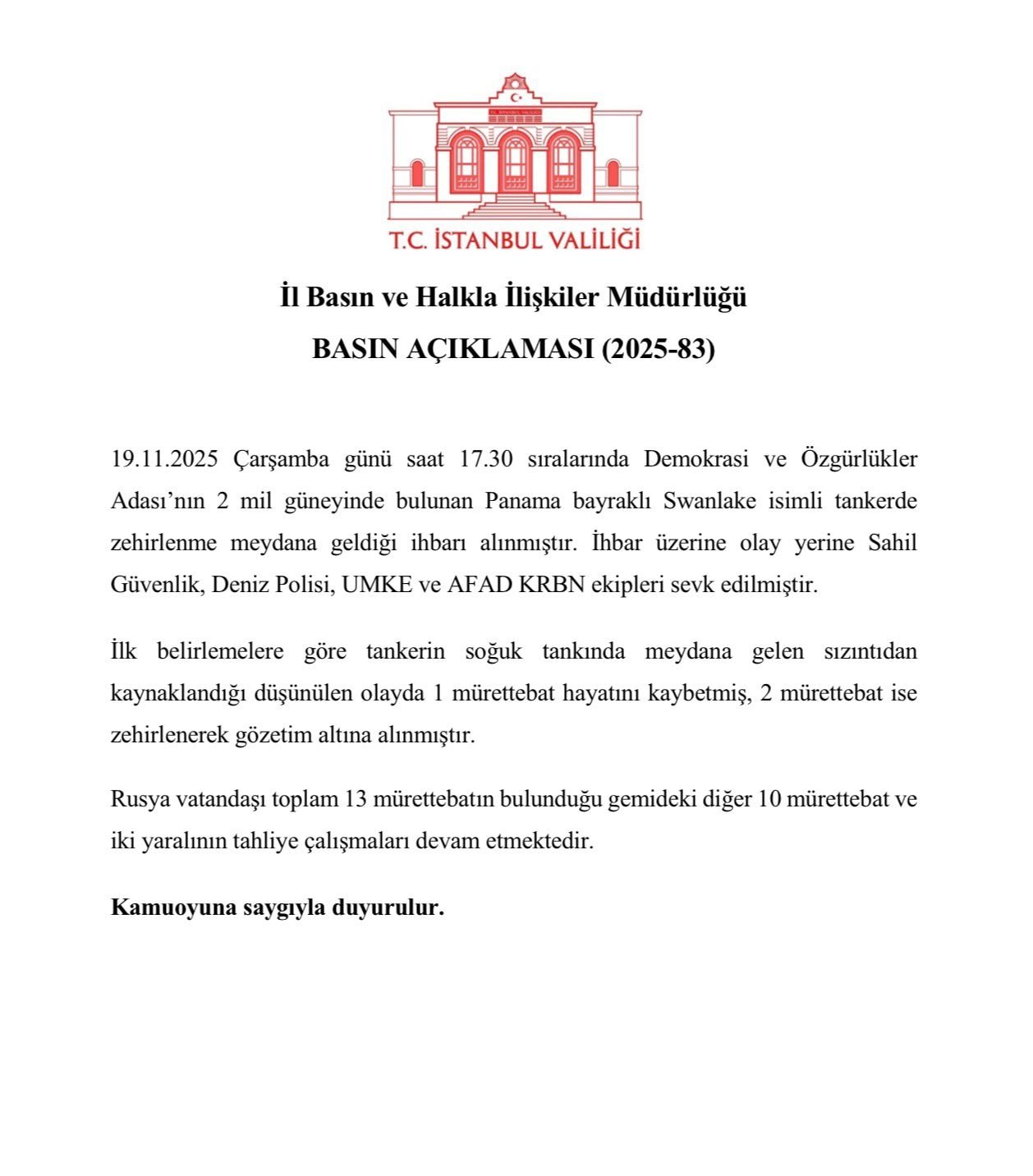 "19.11.2025 Çarşamba günü saat 17.30 sıralarında Demokrasi ve Özgürlükler Adası’nın 2 mil güneyinde bulunan Panama bayraklı Swanlake isimli tankerde zehirlenme meydana geldiği ihbarı alınmıştır. İhbar üzerine olay yerine Sahil Güvenlik, Deniz Polisi, UMKE ve AFAD KRBN ekipleri sevk edilmiştir. İlk belirlemelere göre tankerin soğuk tankında meydana gelen sızıntıdan kaynaklandığı düşünülen olayda 1 mürettebat hayatını kaybetmiş, 2 mürettebat ise zehirlenerek gözetim altına alınmıştır. Rusya vatandaşı toplam 13 mürettebatın bulunduğu gemideki diğer 10 mürettebat ve iki yaralının tahliye çalışmaları devam etmektedir."