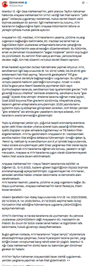 Birleşik Metal-İş Sendikası Genel Başkanı Özkan Atar, İstanbul 13. Ağır Ceza Mahkemesi’nin Gezi Parkı davası tutuklusu şehir plancısı Tayfun Kahraman hakkında Anayasa Mahkemesi’nin (AYM) hak ihlali kararını uygulamayı reddetmesine tepki gösterdi. Atar, mahkemenin tutumunun hukuk devleti ilkesini derinden zedeleyen bir adım olduğunu belirtti.