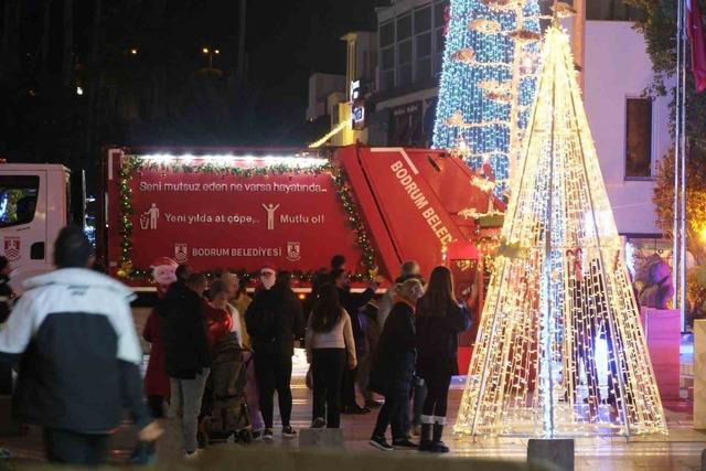 Bodrum Belediye Meydanı’nda, Bodrum Belediyesi ile birlikte Muğla Büyükşehir Belediyesi de sorumluluk alanında kalan bölümde bu sene daha farklı ve yoğun bir süsleme ile ışıklandırma kullandı. Işıklandırmaların yanında 2026 Yılbaşı Pazarı ile birlikte Bodrum Belediye Meydanı’ndan Barış (İskele) Meydanı’na kadar uzanan alan, 2025’ten 2026’ya geçilen anlarda yoğun kalabalığa sahne oldu. Yeni yıla özel olarak giydirilen çöp kamyonu da vatandaşların ilgisini çekti. Üzerinde "Seni mutsuz eden ne varsa hayatında Yeni yılda at çöpe mutlu ol" yazısıyla dikkat çeken çöp kamyonu ve Noel Baba kıyafeti giymiş personellerle birlikte meydanın her köşesinde fotoğraf çektiren binlerce vatandaş, bu anları sosyal medya hesaplarından paylaşarak yeni yılı Bodrum merkezinde karşıladı.