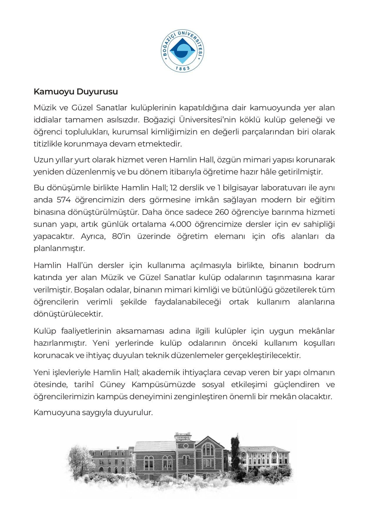 Müzik ve Güzel Sanatlar kulüplerinin kapatıldığına dair kamuoyunda yer alan iddialar tamamen asılsızdır. Boğaziçi Üniversitesi’nin köklü kulüp geleneği ve öğrenci toplulukları, kurumsal kimliğimizin en değerli parçalarından biri olarak titizlikle korunmaya devam etmektedir.