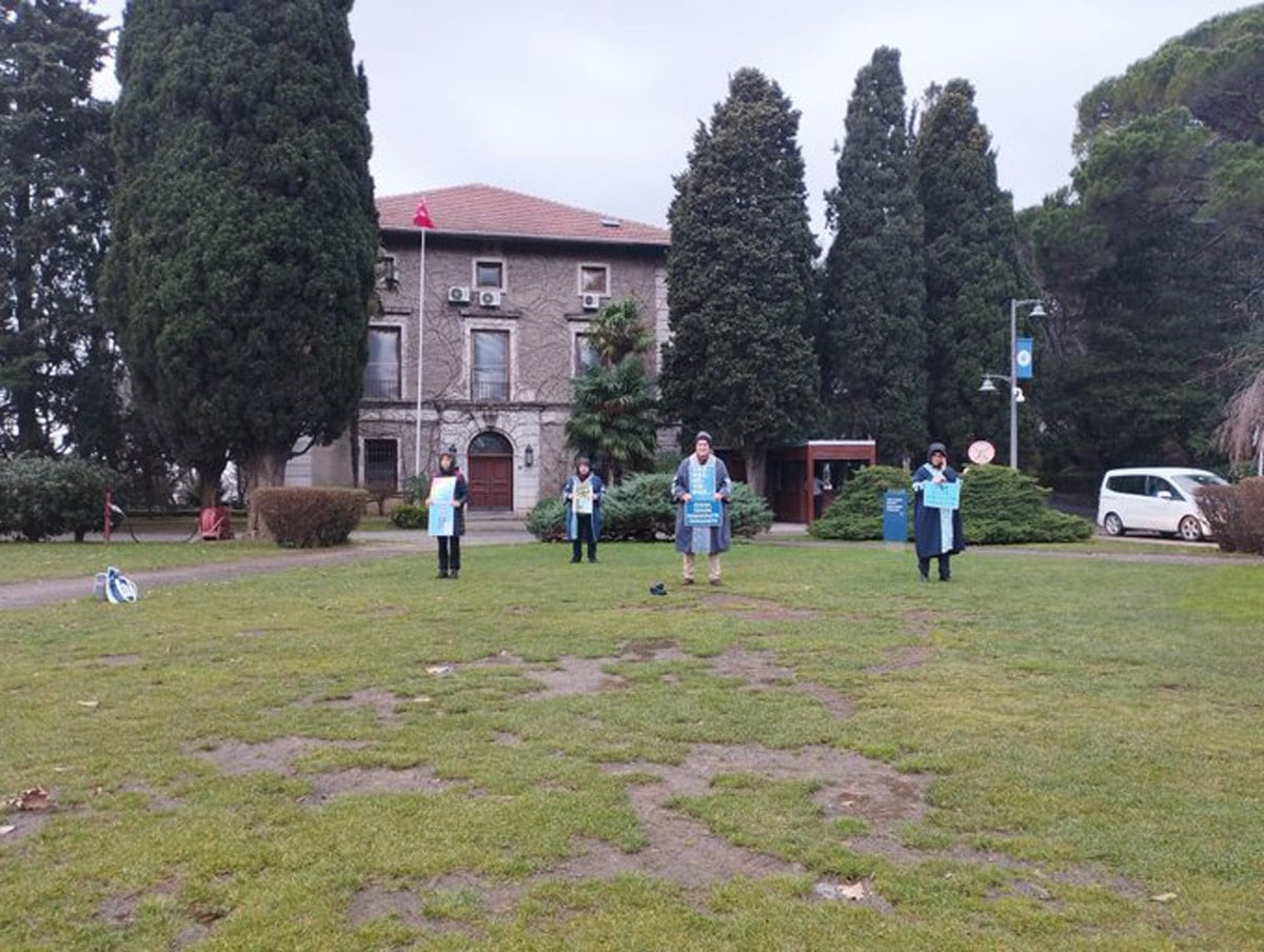 Kayyum rektör atamasını protesto amacıyla 1899. kez düzenlenen akademisyen eylemi yağmur altında yapıldı.