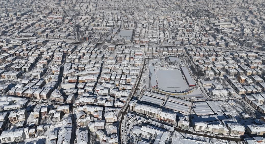 Karayolları ve belediye ekipleri, kar küreme çalışmalarının ardından buzlanma riskine karşı tuzlama çalışması yapıyor. Karla kaplanan kent dronla görüntülendi.