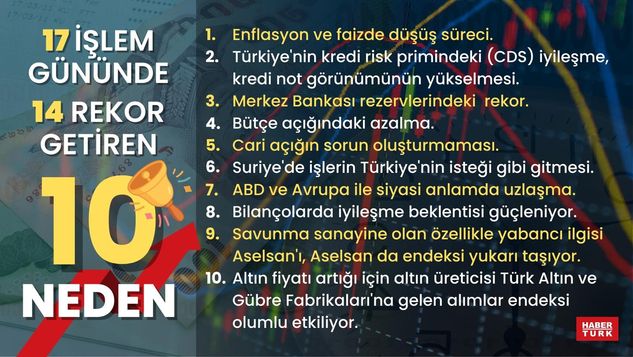 2023'te Türkiye ekonomisini kemiren enflasyona karşı başlatılan mücadele doğrultusunda faizlerin yükseltilmesi ile Borsa İstanbul için başlayan olumsuz süreç artık geride kaldı. 2025 başında yine enflasyon ve faizdeki düşüş sürecinin desteği ile umutlanan ancak İstanbul Büyükşehir Belediyesi'ne yönelik operasyon ile tersyüz olan iyileşme süreci yeni yıl ile birlikte tarihte görülmemiş hale gelmeye başladı. Öyle ki Borsa İstanbul yılbaşından bu yana yüzde 17 yükselerek geçen yılki kazancı 17 günde geçerken 17 günde 14 rekora ulaşarak rekorun da rekorunu kırdı. Aynı sürede ABD'de S&P borsası 5, Almanya 7, Japonya borsası 2 gün rekor görebildi.