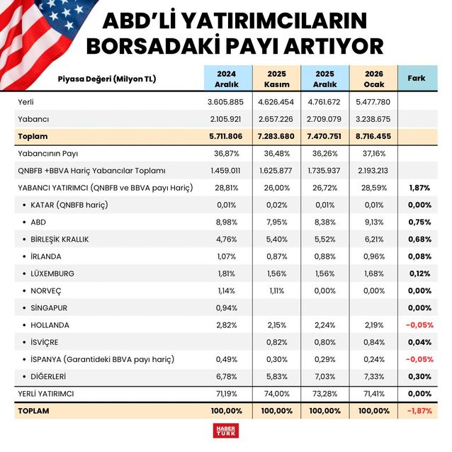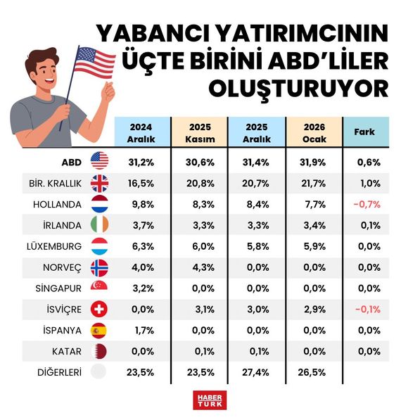 Ülkeler bazında bakıldığında ise ocak sonu itibariyle ABD'li yatırımcıların borsadaki toplam payının yüzde 7,95'ten yüzde 9,13'e çıktığı görülüyor. Şubat ayının ilk 17 günü veya kalan sürede bu rakamın artmış olması veya artacak olması da çok muhtemel. İngilizler'in payı da toplam içinde yüzde 5.40'ten yüzde 6.21'e ulaştı. Bu iki dev ülkeden gelen yatırımın 12-15 Ocak'ta Hazine ve Maliye Bakanı Mehmet Şimşek ile Merkez Bankası Başkanı Fatih Karahan'ın bu ülkelerde yaptığı ve büyük ilgi gören yatırımcı toplantıları ve özellikle ABD ile siyasi ilişkilerin olumlu yürümesinin ardından gelmesi dikkat çekici.