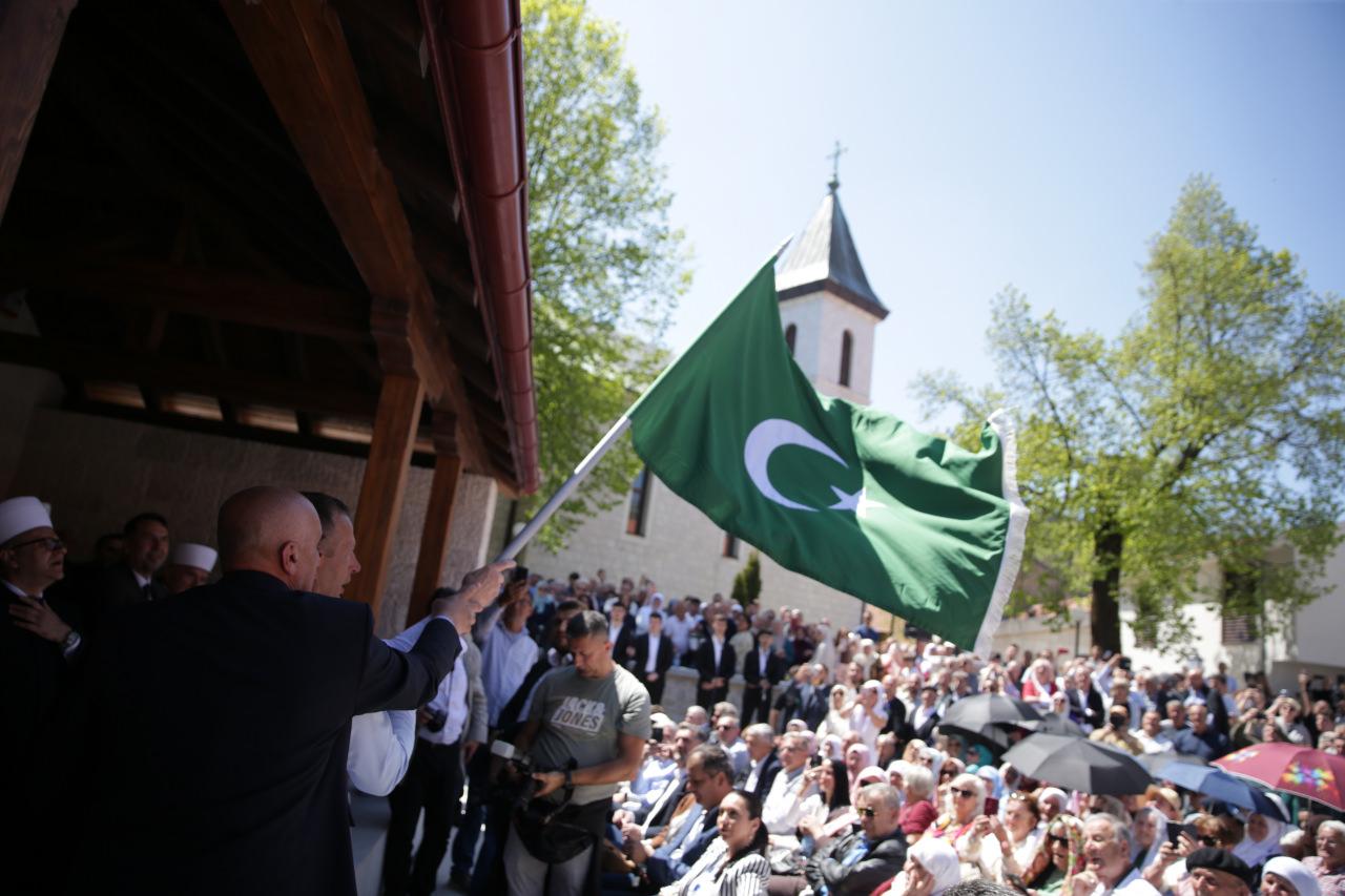 Bosna Hersek İslam Birliği Başkan Yardımcısı Enes Ljevakovic ise caminin yeniden yapılmasının bölge için önemli olduğunu ifade ederek, Cumhurbaşkanı Recep Tayyip Erdoğan'a teşekkür etti. Konuşmaların ardından tekbirlerle cami açılışı yapılırken, 1992'den beri ilk defa camide yeşil zemin üzerine beyaz ay ve yıldızın bulunduğu Bosna Hersek İslam Birliği bayrağı açıldı.
