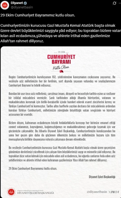 Diyanet’in sosyal medya hesabından yapılan açıklamada, hutbelerde Cumhuriyet’in önemi ve vatandaşlara çağrılan mesajlar öne çıkarıldı, Atatürk’ün adı metinde geçmedi.