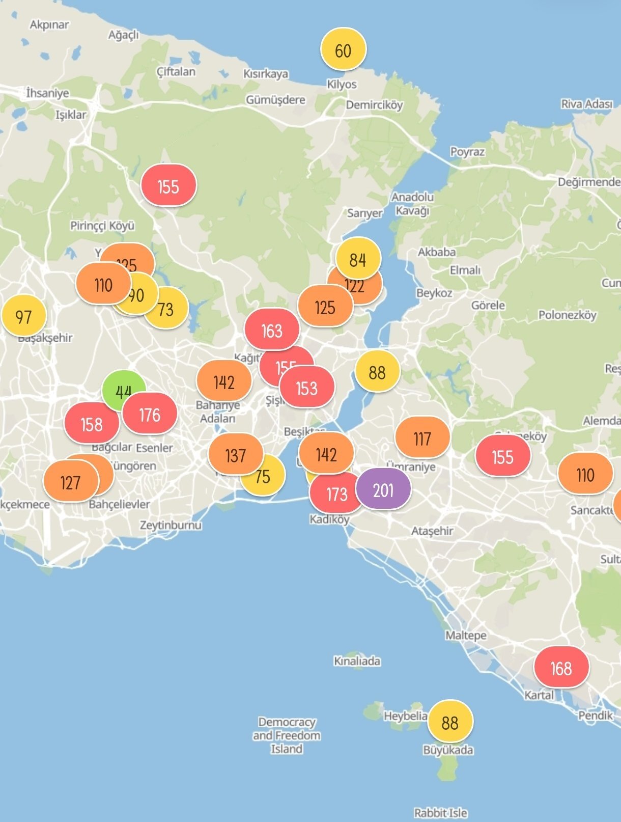 Hava kirliliğine yönelik bir paylaşım da Boğaziçi Üniversitesi öğretim üyesi Prof. Dr. Levent Kurnaz'dan geldi. Kurnaz, sosyal medya hesabından yaptığı paylaşımda İstanbul'un ilçelere göre hava kirliliği haritasını paylaşarak "Bugün hava İstanbul'da çok kötü. Sarı kötü ama idare eder, turuncu sağlık sorunu olanlar dışarıya çıkmasın, kırmızı kimse dışarıya çıkmasın demek. Morun ne demek olduğunu düşünmek istemem. Lütfen en azından dışarıya çıkarken maske takın." şeklinde konuştu.