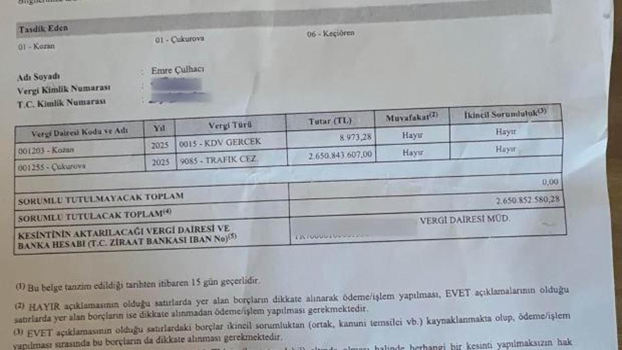 Kozan ilçesinde yaşayan Avukat Emre Çulhacı, adına 2 milyar 650 milyon 843 bin 607 lira tutarında trafik cezası kaynaklı vergi borcu göründüğünü öğrenince hayatının şokunu yaşadı. Türkiye'de geçen yıl kesilen toplam trafik cezalarının yaklaşık 30'da birine denk gelen rakam karşısında şoku atlatan avukat Çulhacı, yaptığı görüşmelerle hatayı düzelttirdi.