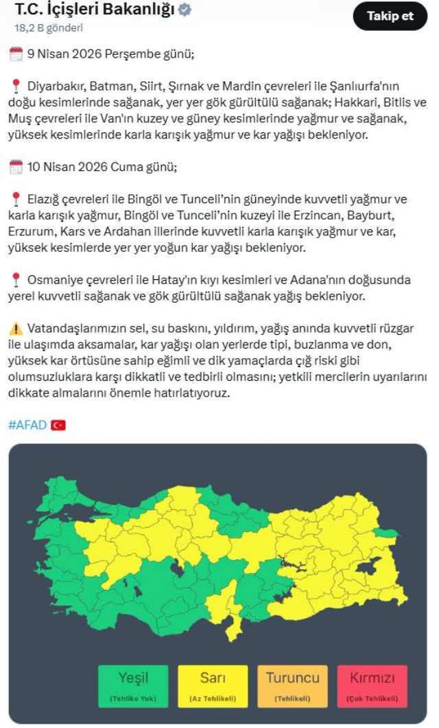 VATANDAŞLARA UYARIİçişleri Bakanlığı, vatandaşların sel, su baskını, yıldırım, kuvvetli rüzgar ve ulaşımda aksamalar gibi olumsuzluklara karşı dikkatli olmasını istedi. Ayrıca kar yağışı beklenen bölgelerde tipi, buzlanma ve don ile çığ riskine karşı tedbirli olunması gerektiği vurgulandı.
