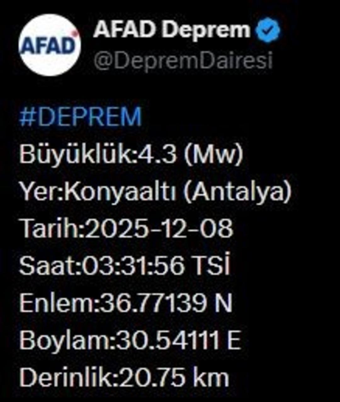 AFAD'ın paylaştığı bilgilere göre, Antalya’nın Konyaaltı ilçesinde saat 03.31’de 4.3 büyüklüğünde deprem meydana geldi. Merkezi Konyaaltı olan depremin derinliği 20.75 kilometre olarak ölçüldü.