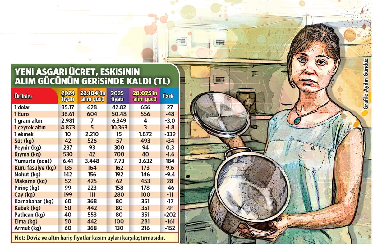 Asgari ücrete yüzde 27 zam yapıldı, ancak aynı dönemde dar gelirlinin mutfağına giren temel gıda ürünlerinin fiyatı ortalama yüzde 44.5 arttı. Aradaki 27.5 puanlık fark yüzünden asgari ücretin reel alım gücü daha cebe girmeden üçte bire yakın oranda buhar oldu. Bu yılın ocak ayındaki asgari ücretin alım gücüyle market sepetine konulan ürünlerin aynısı 2026’nın Ocak ayında da alınmak istenirse yaklaşık her 3 üründen 1’inin geri bırakılması gerekecek. Çarşı pazarı yangın yerine çeviren fiyat artışları asgari ücrete asgari zam yapılırken fiyatlara azami zamların yapıldığını ortaya koydu.