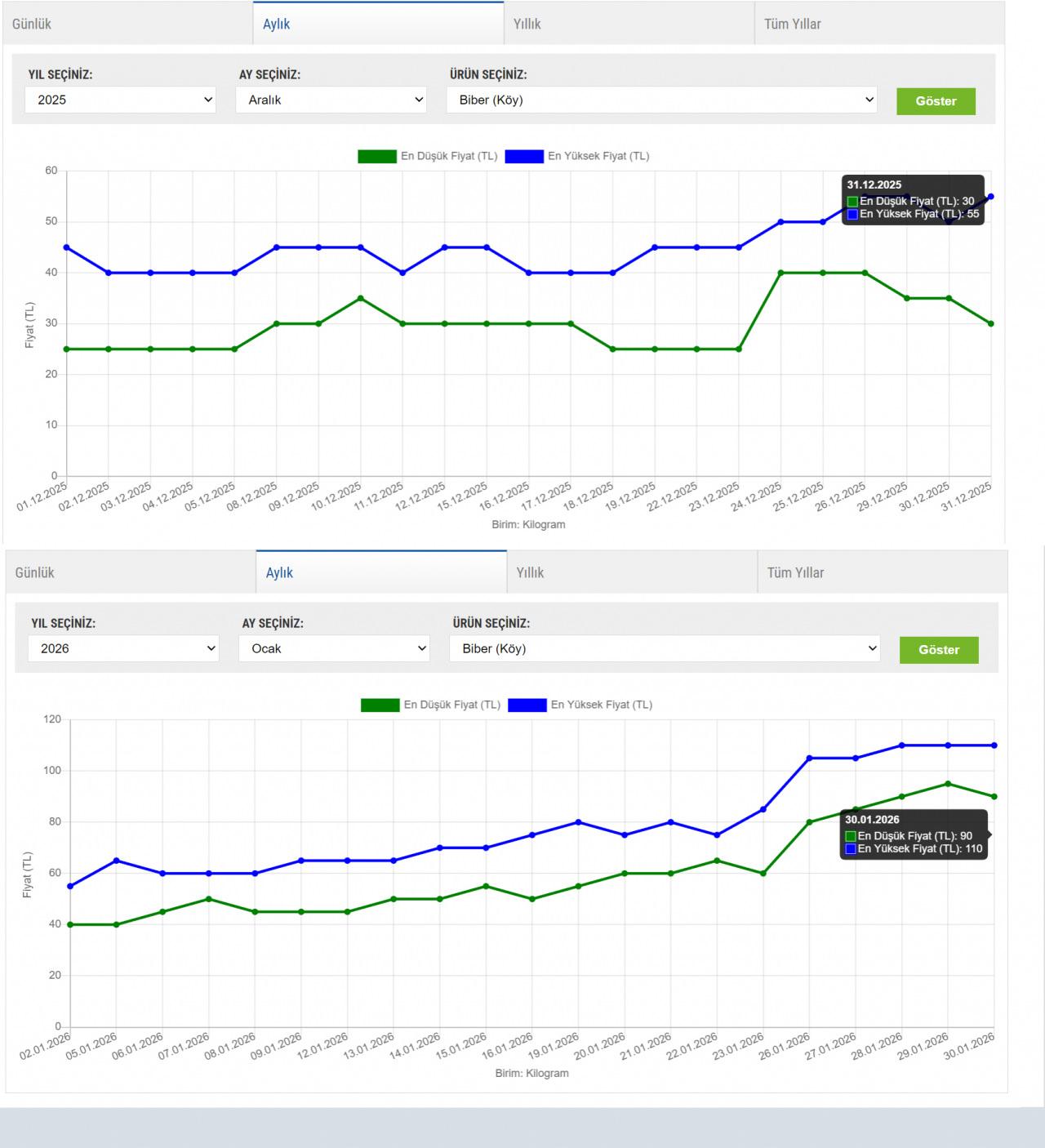 Benzer tablo birçok üründe de görülüyor. Örneğin köy biberi; Aralık 2025’e en yüksek 45 TL’den başlarken, ay sonunda fiyat 55 TL’ye kadar yükseldi. Ocak 2026’ya 55 TL’den başlayan köy biberi, ilginç bir şekilde ay sonunda 110 TL’ye kadar çıktı. Bu da yüzde 100 zam oranına tekabül ediyor.