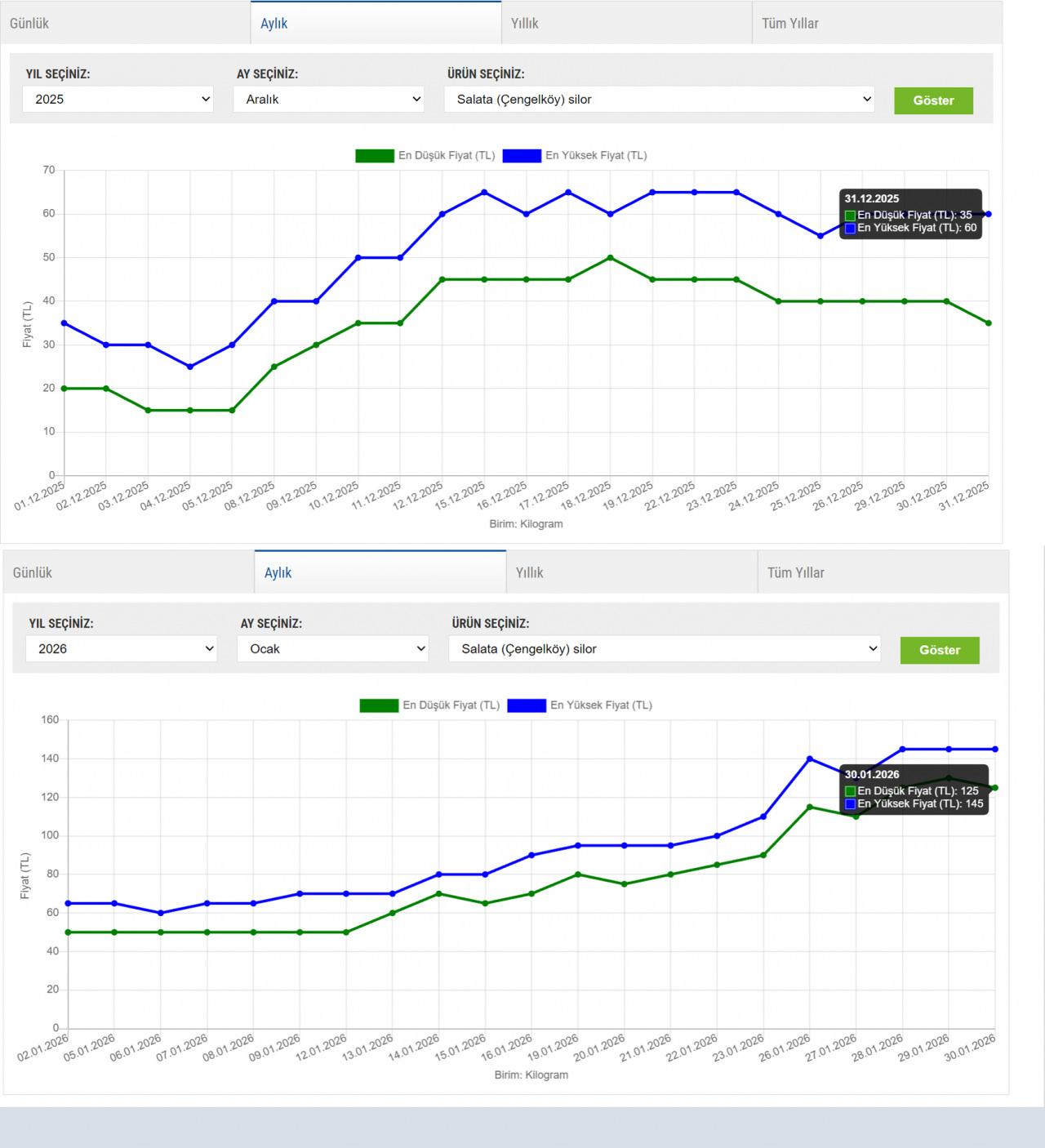 Salatalık fiyatları marketlerde 130 TL seviyesinden satılırken, işin daha ilginç yanı hal fiyatlarında dikkat çekti. İstanbul Hali’nde Aralık 2025’e en yüksek 35 TL’den başlayan Çengelköy salatalık, Aralık 2025’i 60 TL’lik satış rakamıyla kapattı.