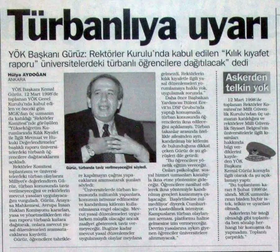 Üniversitelerin hizaya getirilmesi için görevlendirildiği belirtilen Kemal Gürüz’ün talimatıyla Şubat 1998’de toplanan YÖK Genel Kurulu’nun ‘kılık kıyafet genelgesi’ne göre başörtülü öğrencilerin üniversitelere sokulmaması hususunda bütün rektörler ikaz edildi. Dönemin rektörleri yasakçılara sadakat yarışına girdi.